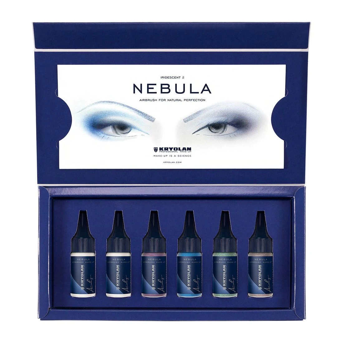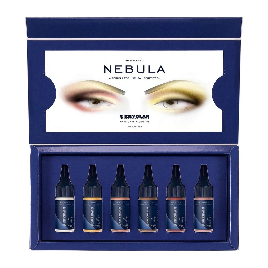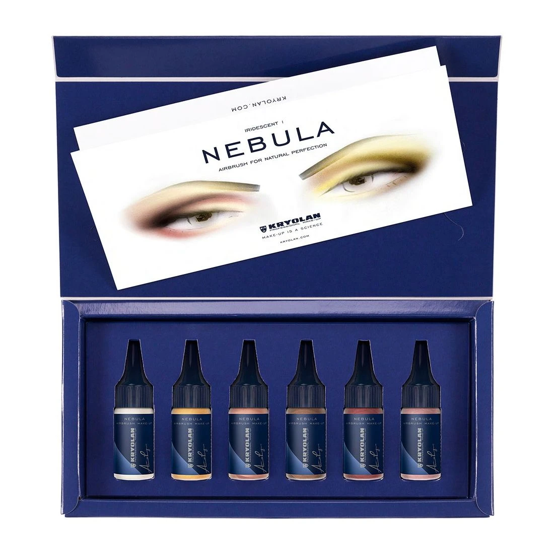 The Nebula Airbrush Make-up KIt ‘Iridescent’ consists of 6 innovative silicone colors with a radiant sheen, particularly suitable for eye shadow or blusher. Due to its micronized pigments, Nebula provides an extraordinary natural and flawless finish and is scientifically formulated to deliver a long-lasting, durable result. It can be applied using a spray gun or a brush. Do not inhale and only use in well-ventilated rooms. Shake well before use.