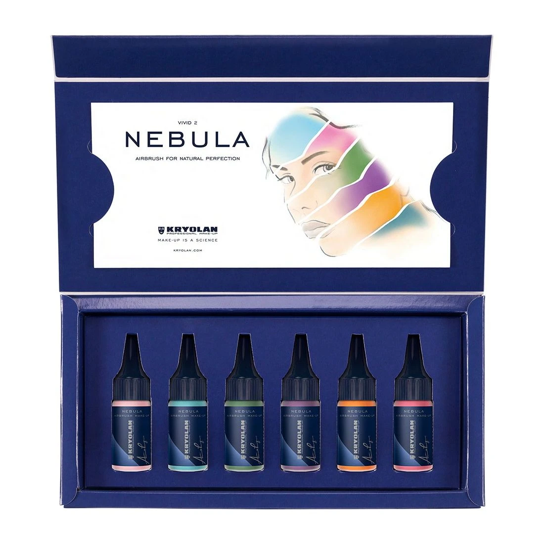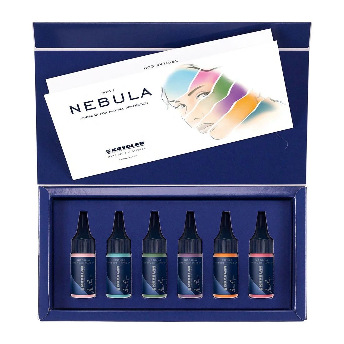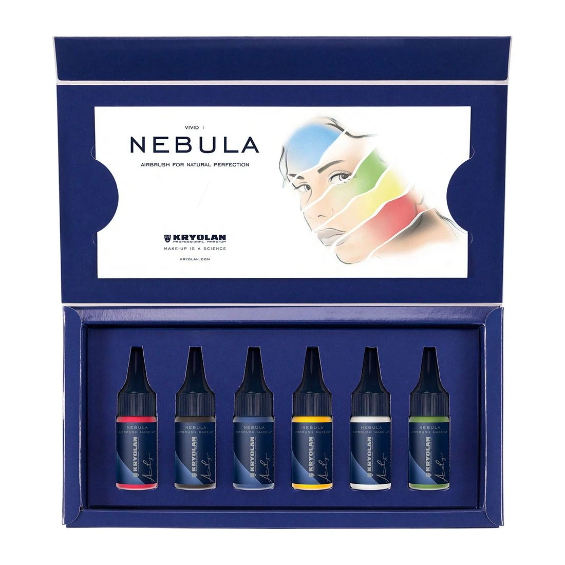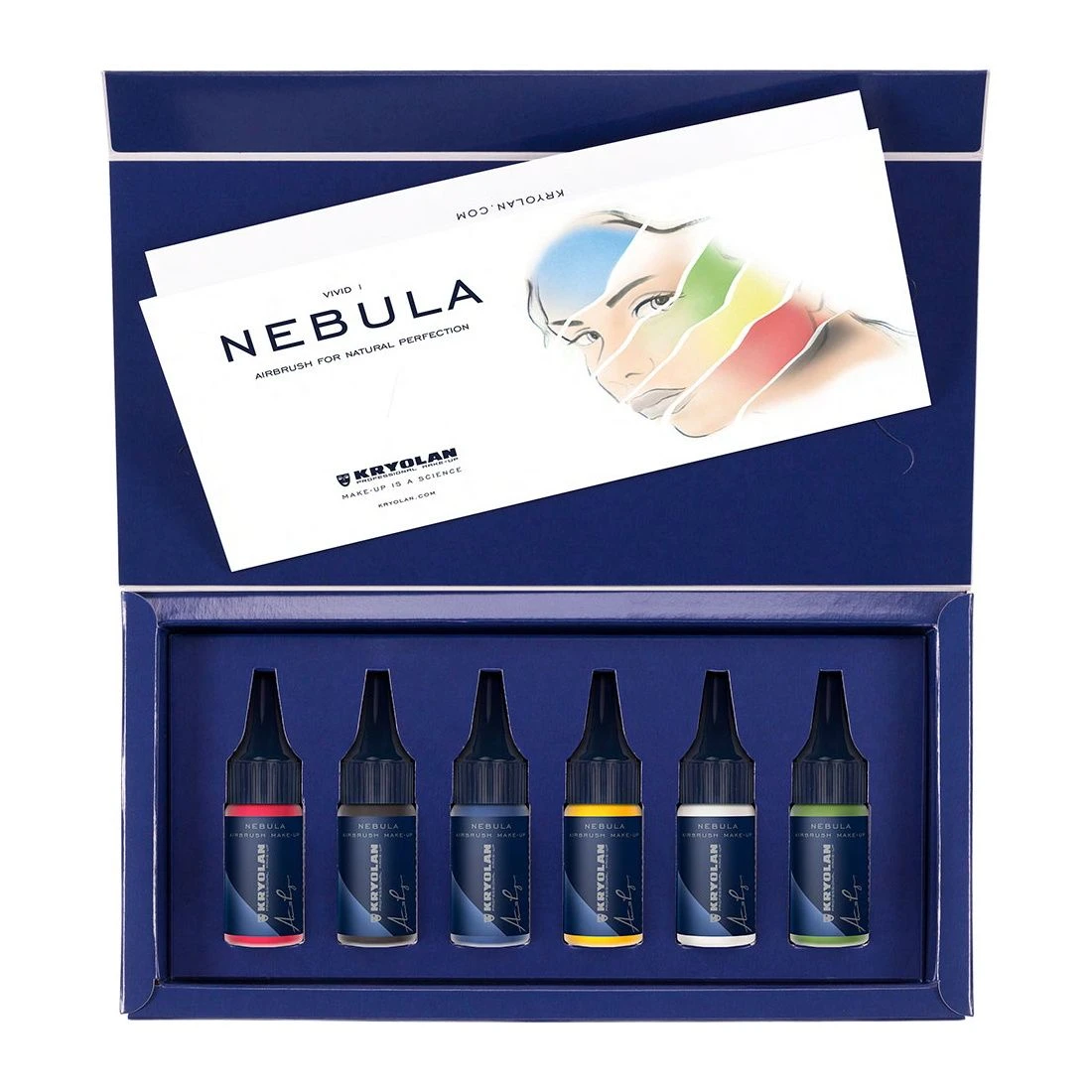 The Nebula Airbrush Make-up Set ‘Vivid’ consists of 6 innovative silicone colors in intense shades. Due to its micronized pigments, Nebula provides an extraordinary natural and flawless finish and is scientifically formulated to deliver a long-lasting, durable result. It can be applied using a spray gun or a brush. Do not inhale and only use in well-ventilated rooms. Shake well before use.